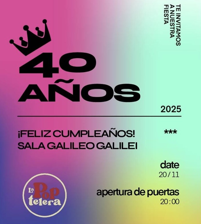 El jueves 20 de noviembre Galileo Galilei celebra sus 40 años de magia y programación estupenda! La Poptelera será la banda encargada de aacompañar esta ceremonia con música en directo.